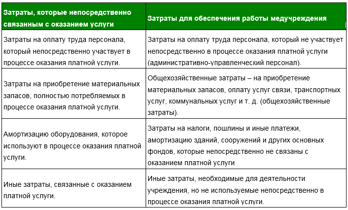 Затраты учреждения на платную услугу распределите на затраты, которые непосредственно связаны с оказанием платной медицинской услуги, и затраты, которые нужны, чтобы обеспечить работу учреждения, но не используются при оказании платной услуги.