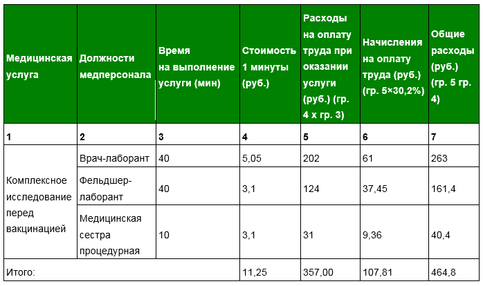 Теперь, когда рассчитали стоимость 1 минуты работы медперсонала, можем подсчитать общую величину расходов на оплату труда специалистов, которые участвуют в обследовании перед вакцинацией.