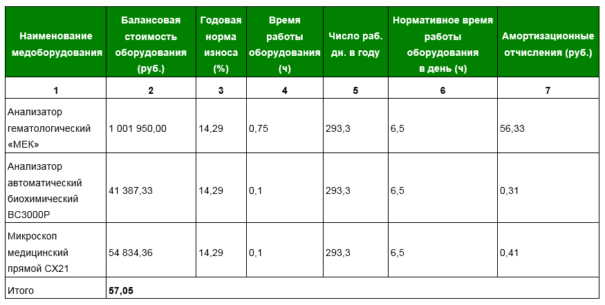 ПРИМЕР: Как рассчитать величину амортизации. Для проведения исследований медперсонал использует гематологический и биохимический анализатор, а также медицинский микроскоп. Значит, расходы на амортизацию состоят из суммы расходов на каждый вид оборудования.
