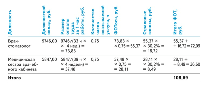 Бюджетное медицинское учреждение планирует открыть стоматологический кабинет. Услугу оказывает врач-стоматолог и медицинская сестра врачебного кабинета. Оклад за месяц врача — 9746,00 руб., медицинской сестры 5847,00 руб. Дополнительных выплат врачу нет. Средняя продолжительность лечения 1 зуба составляет 45 минут (0,75 ч).