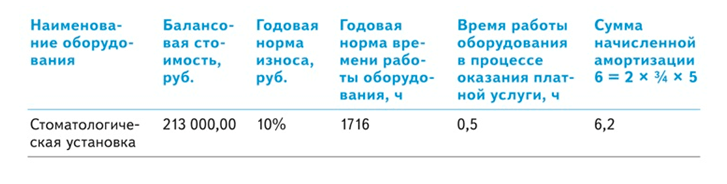 Сумма начисленной амортизации оборудования, которое используют при оказании платной медуслуги, определяют исходя из балансовой стоимости оборудования, годовой нормы его амортизации и времени работы оборудования в процессе платной медуслуги.