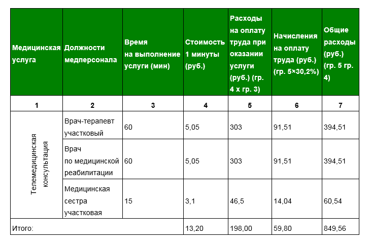 ПРИМЕР: Расчет расходов на оплату труда. В медорганизации телемедицинскую консультацию проводят врач-терапевт участковый, участковая медсестра и врач по медицинской реабилитации стороннего медучреждения. Каждый из них тратит на консультацию по 60 минут, а медсестра при консультации — 15 минут. При этом минута работы врача стоит 5,05 руб., а среднего персонала — 3,1 руб. (данные предыдущего примера). В этом случае врачам за час работы следует заплатить 606 руб. (5,05 руб. x 60 мин x 2), а медсестре — 46,5 руб. (3,1 руб. x 15). Однако также учитывайте страховые начисления на зарплату в размере 30,2 процента. Тогда расходы на зарплату врачей составят 789,02 руб. (606 606×0,302), медсестры — 60,54 руб. (46,5 46,5×0,302), а всего — 849,56 руб.