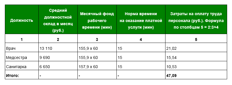 Расчет затрат на оплату труда персонала, непосредственно участвующего в процессе оказания платной услуги, приводится по формуле согласно таблице.