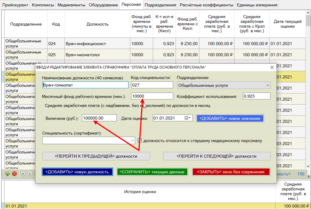 Этап 2. Установите в справочнике «Персонал» для должностей требуемые значения временного и зарплатного фонда