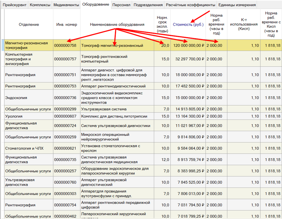 Этап 4. Отсортируйте позиции в справочнике «Оборудование» по убыванию балансовой стоимости и при необходимости скорректируйте для дорогостоящего оборудования инвентарный номер (не влияет на ценообразование), название оборудования, нормативный срок эксплуатации, постановочную стоимость и норматив рабочего времени (по режиму работы отделения)