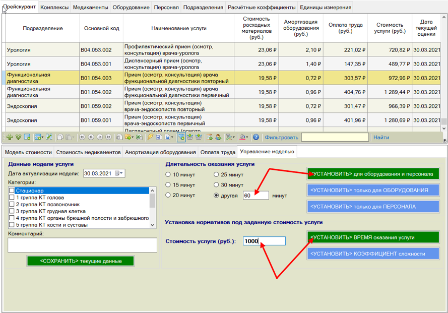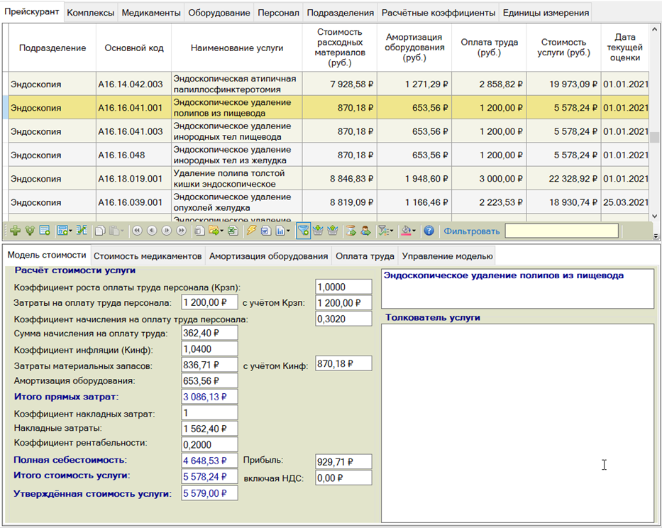 Модели услуг представляю собой обобщённые технологические карты медицинских услуг, включающие количественные (или временные) параметры расхода, формирующие финансовые затраты на медикаменты, оплату персонала, амортизацию оборудования, накладные расходы, по методу прямого счета.