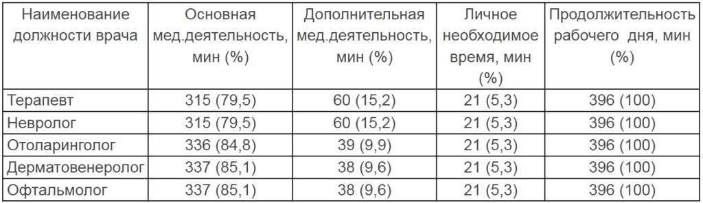 Продолжительность рабочей недели врачей, оказывающих амбулаторно-консультативную помощь, в соответствии с КЗоТом составляет 33 часа. Продолжительность рабочего дня при пятидневной неделе составляет 6 час. 36 мин. (396 мин.). Время основной медицинской деятельности составляет от 79,5 до 85,1%, дополнительная медицинская деятельность — 9,6 — 15,2%; личное необходимое время — 5,3% (табл. 2).