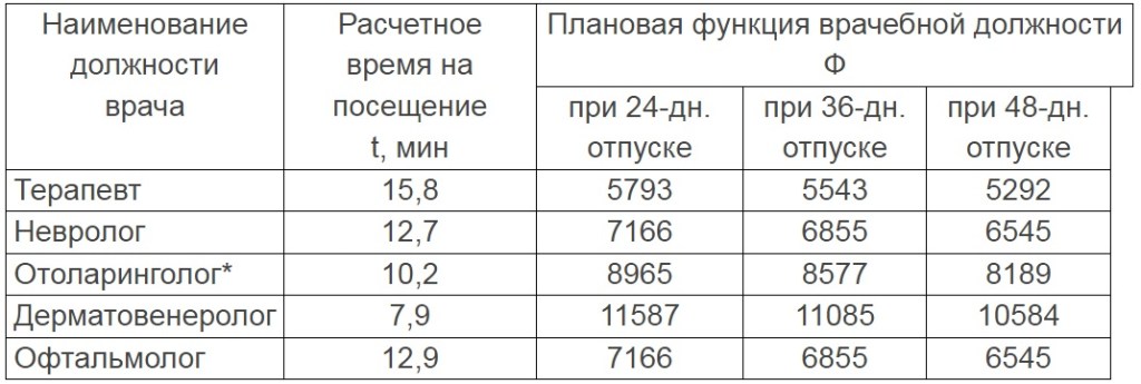 Плановая функция врачебной должности зависит от продолжительности отпускного периода. Годовой бюджет рабочего времени должности врача консультативной поликлиники в 1998 году составит при 24-дневном отпуске 1524,6 часа, при 36-дневном — 1458,6 часа, при 48-дневном — 1392,6 часа.