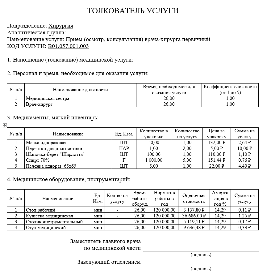 - Заполненные технологические карты более 2 000 стационарных услуг с внесёнными нормативами расхода и времени.
